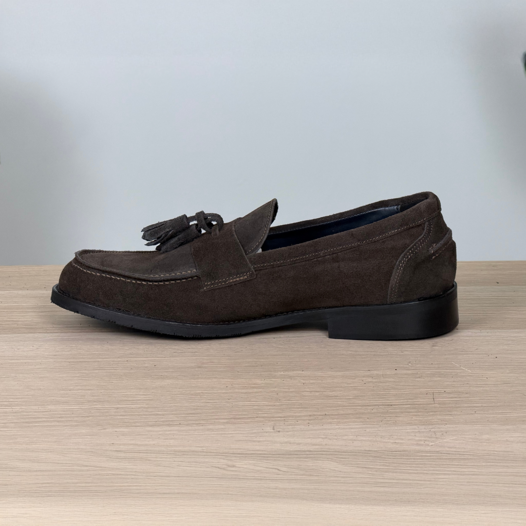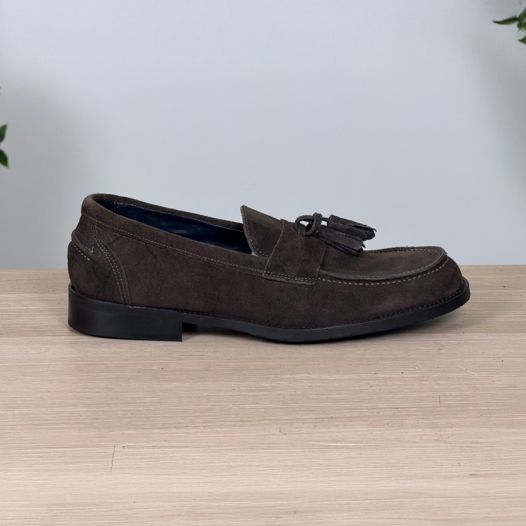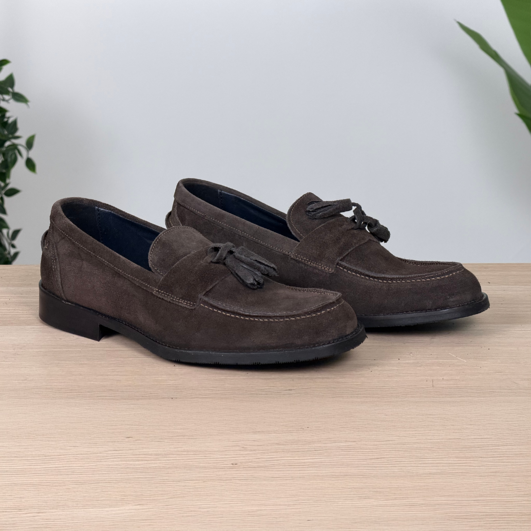 Mocassino con nappine in pelle scamosciata di vitello, realizzato interamente in Italia, simbolo di uno stile raffinato ma disinvolto.