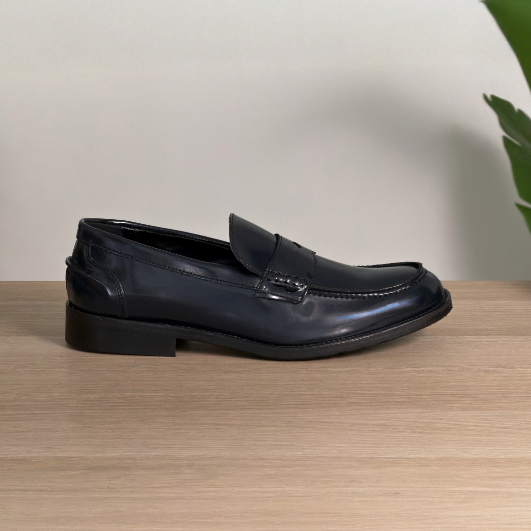 Mocassino classico in pelle lucida e suola in cuoio - Blu